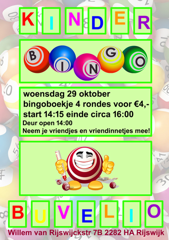 Schuif woensdag na de vakantie aan bij de Kinderbingo bij Buvelio. Neem gezellig je vriendjes en vriendinnetjes mee. Er zijn weer leuke prijzen te winnen!